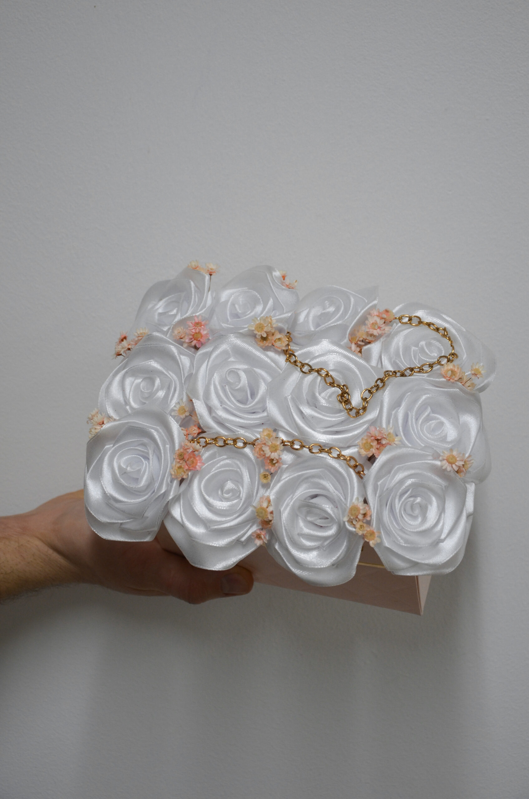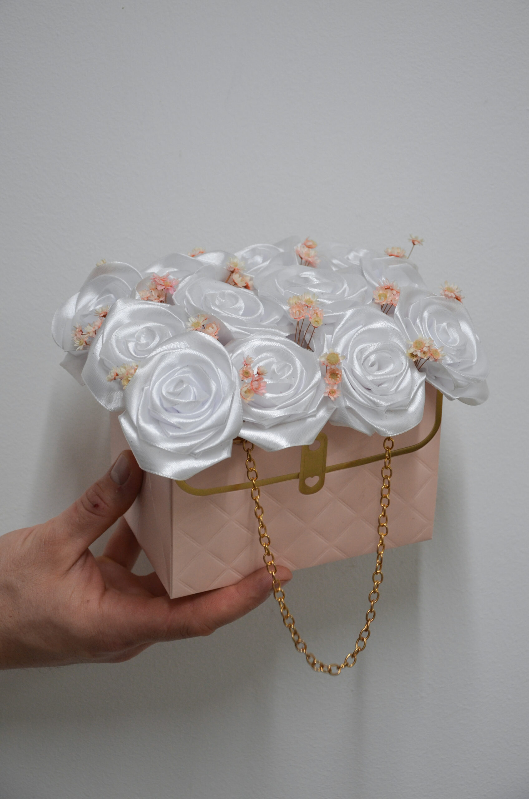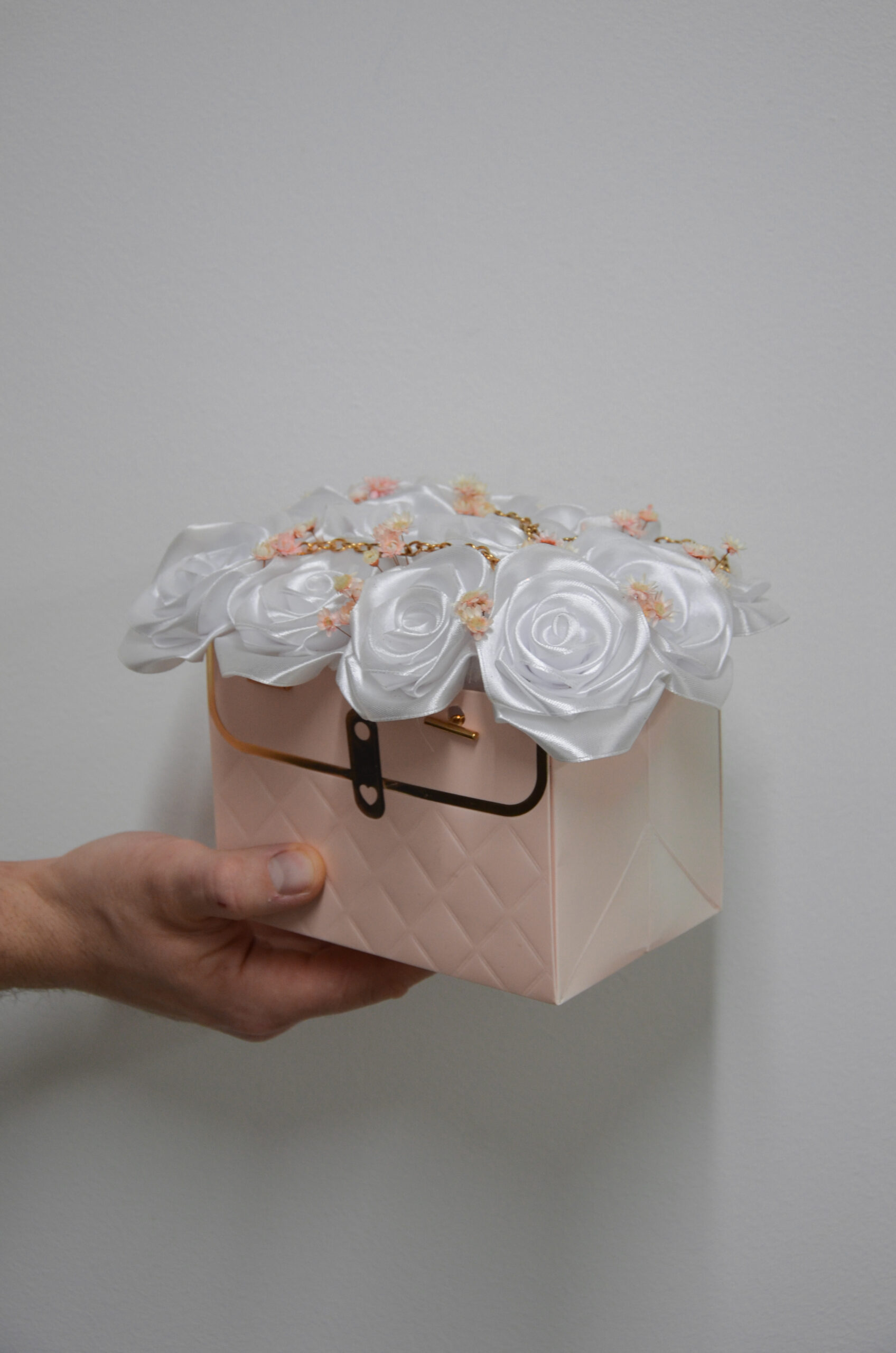 Subtelna i niezwykle elegancka kompozycja kwiatowa, która zachwyca lekkością formy i harmonijną kolorystyką. Aranżacja składa się z pięknych, białych róż wykonanych z wysokiej jakości satynowego materiału, uzupełnionych drobnymi, delikatnymi, stabilisowanymi kwiatkami w pastelowych odcieniach. Całość została umieszczona w stylowym, jasnoróżowym flower boxie o fakturowanym wykończeniu, ozdobionym złotymi detalami oraz dekoracyjnym łańcuszkiem. Kompozycja doskonale sprawdzi się jako prezent na wiele okazji – ślub, komunię, chrzest, urodziny, rocznicę lub jako wyjątkowa dekoracja wnętrza. Trwała forma aranżacji sprawia, że kompozycja przez długi czas zachowuje swój estetyczny wygląd, stanowiąc stylową i nienachalną ozdobę każdego wnętrza.