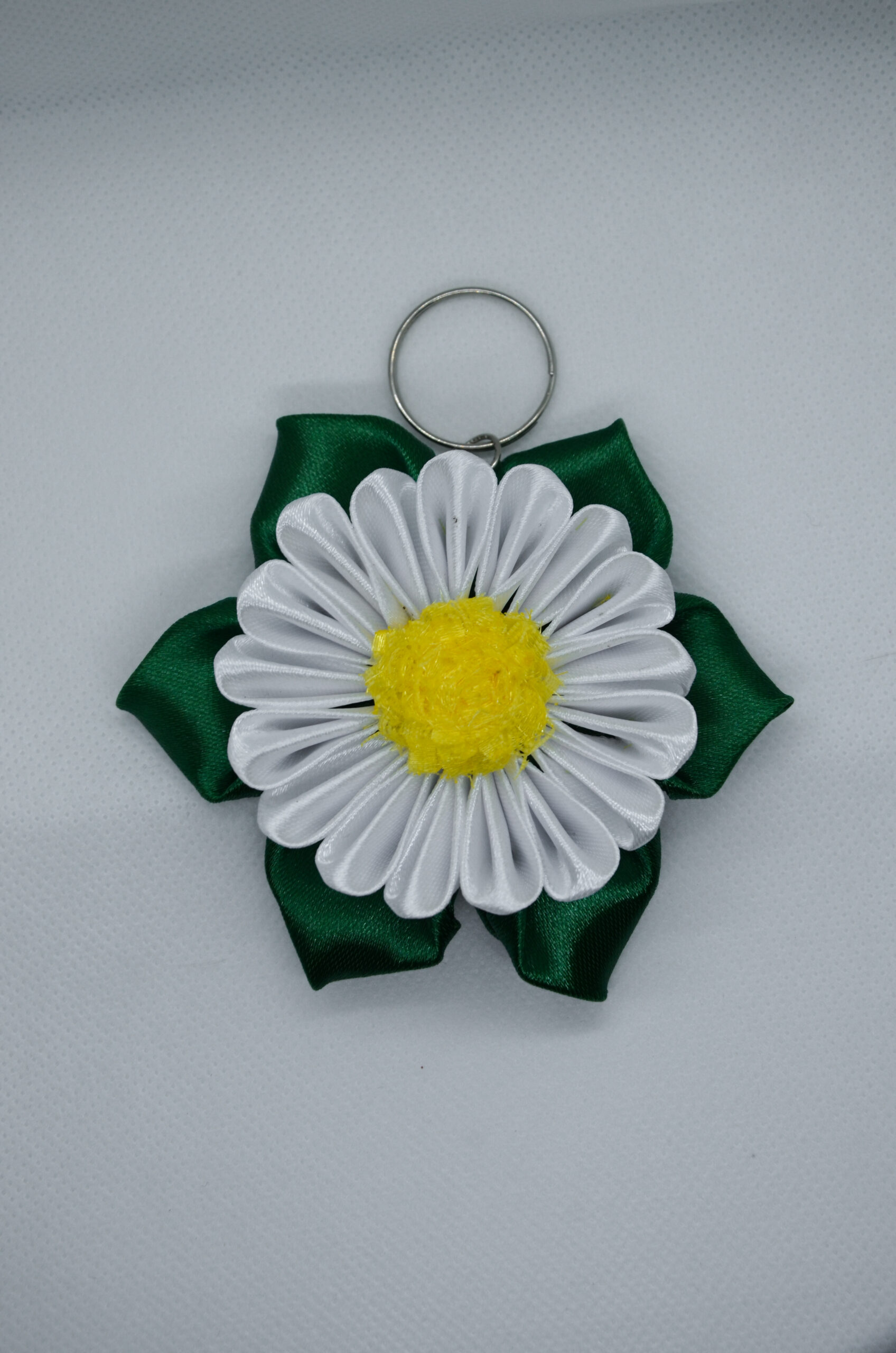 Uroczy, ręcznie wykonany brelok w kształcie stokrotki z białej satyny z radosnym żółtym środkiem. Idealny jako wiosenny dodatek do kluczy lub plecaka oraz jako drobny upominek na Dzień Nauczyciela czy zakończenie roku.