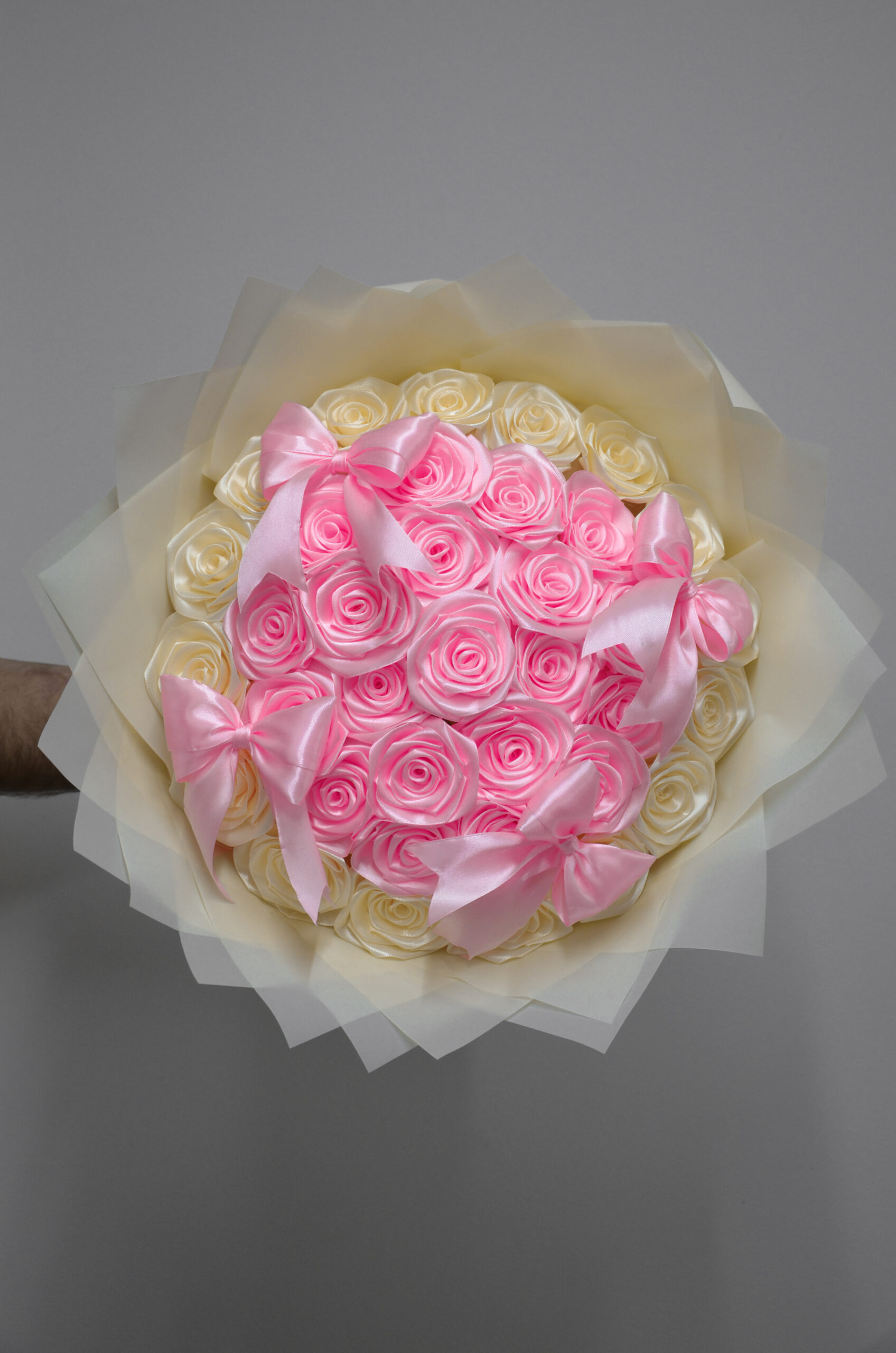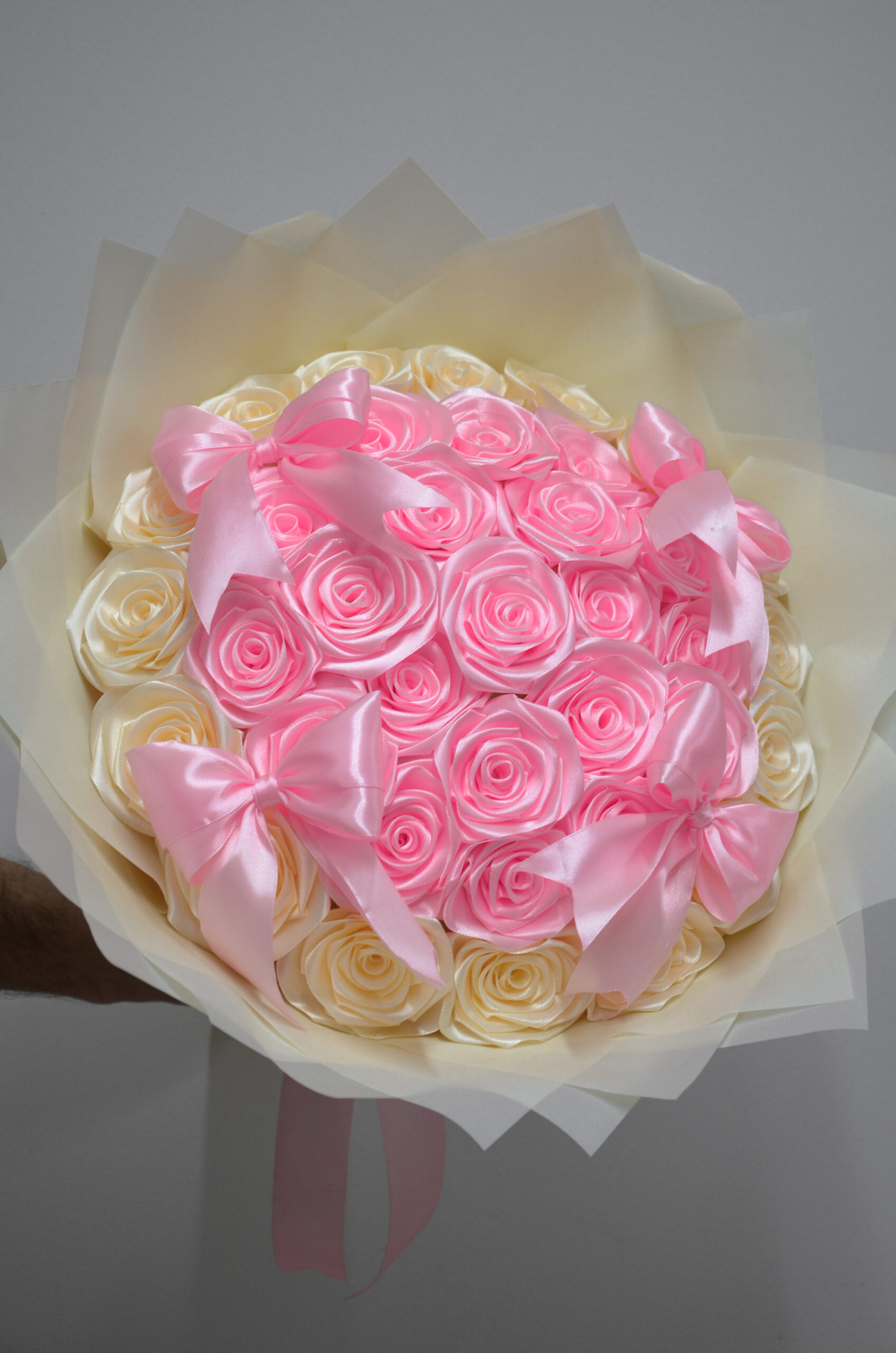 Elegancka kompozycja 36 róż w odcieniach różu i kremu, ozdobiona satynowymi kokardami. Idealny wybór na romantyczny prezent, który zachwyca klasą i subtelnością.