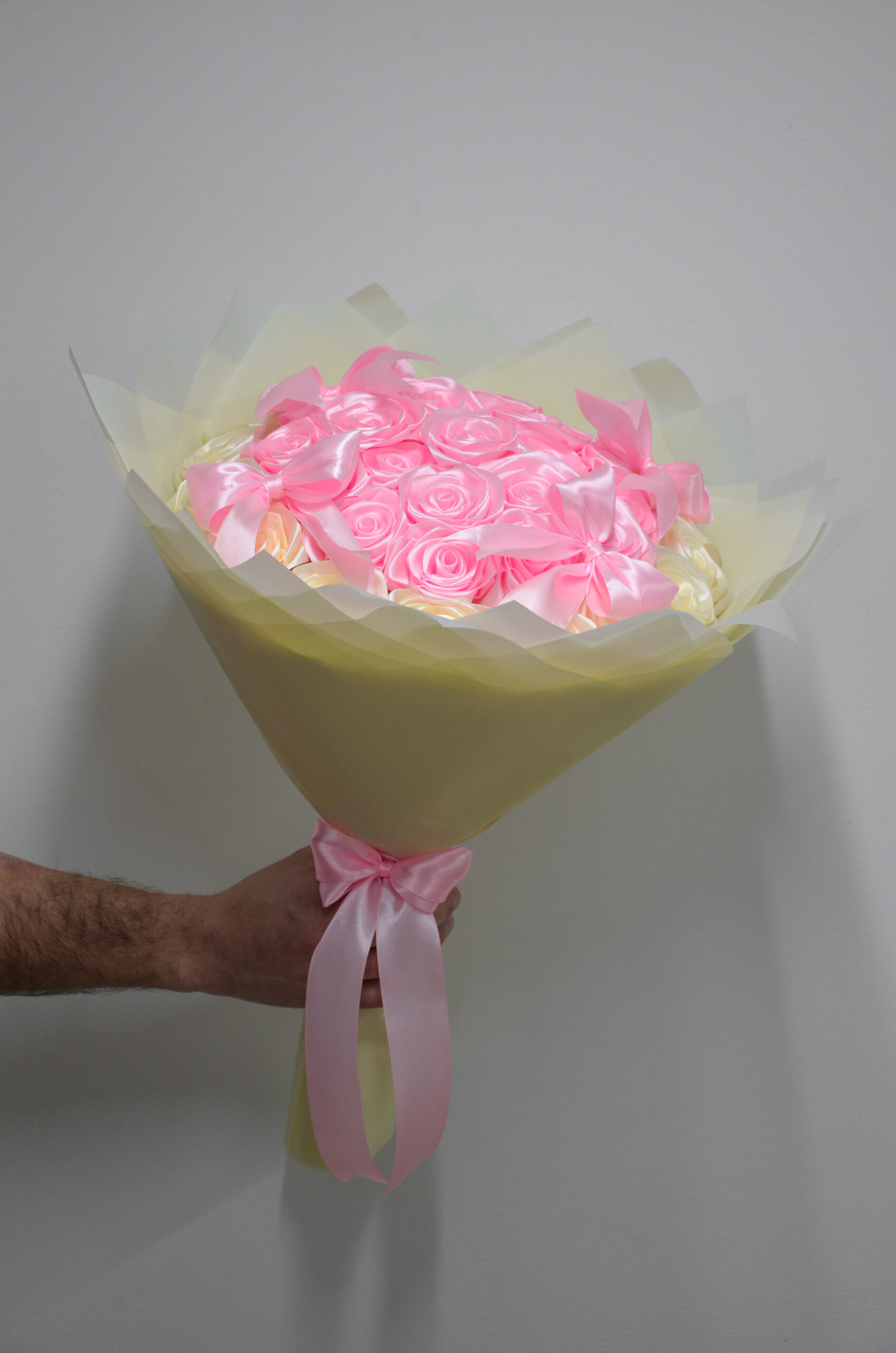 Bukiet kremowo-różowych róż z satynowymi kokardami