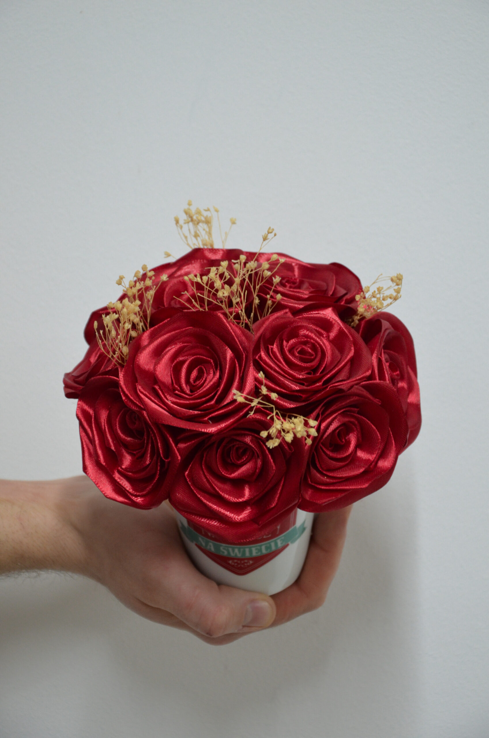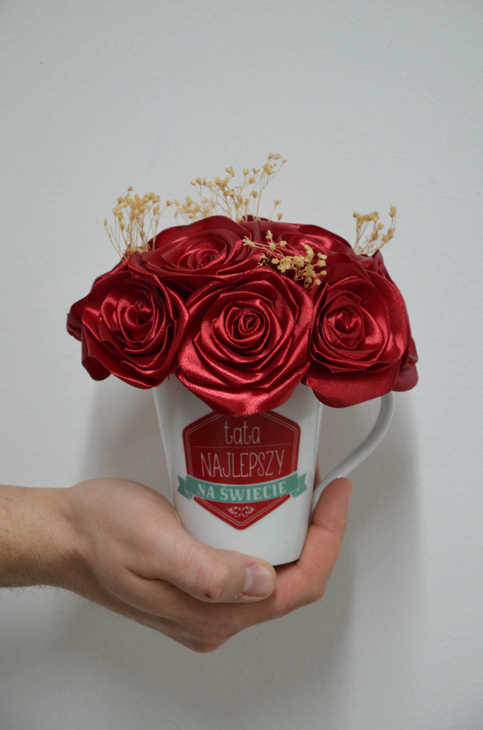 Kompozycja kwiatowa na Dzień Taty – czerwone róże w kubku